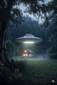 À mon arrivée, Claude m’accompagna jusqu’au chalet, situé à quelques mètres de sa maison, pour que je puisse y déposer mes affaires. Pendant le trajet, une petite voix intérieure, me souffla : « Ce soir, j’ai une expérience extraterrestre. » Et, au fond de moi, je savais que cela allait se produire. C’était une certitude indiscutable. Je décidai d’en faire part à Claude. Il resta silencieux un instant, visiblement intrigué, ne sachant trop que penser de moi. Imaginez : une étrangère venue de nulle part, débarquant chez lui lui annonçant avec calme l’arrivée imminente des Frères de l’Espace.